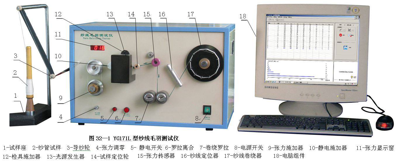 結構原理:本機采用高可靠 LED 可見光光源將紗線、毛羽投影成像,再采用高速計數采集方法結合微機,把毛羽擋光引起的變化轉換成電信號,由計算機進行信號處理、記數統計、顯示、打印。