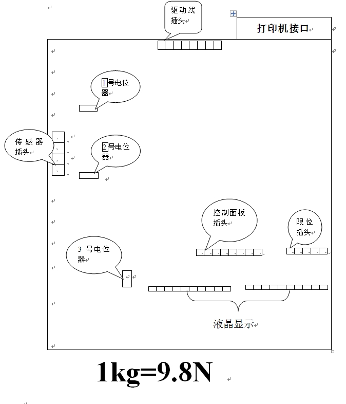 4,放一個2kg的砝碼(砝碼越大越好),看一下液晶屏幕上“拉力”的位置上是顯示多少,正常情況下應(yīng)該顯示20N左右,稍有偏差是允許的,如果沒有達(dá)到這個值,則可以調(diào)節(jié)“線路板示圖”中的2號電位器,調(diào)節(jié)的方法和以上調(diào)節(jié)1號電位器是一樣的,調(diào)到到相應(yīng)的數(shù)字就可以了,儀器強(qiáng)力標(biāo)定完成。